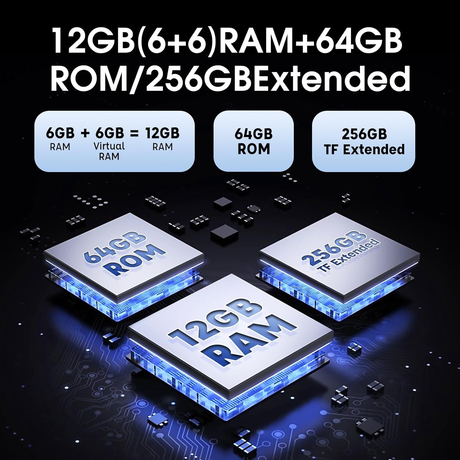 - Up to 12GB RAM (6GB RAM + 6GB Virtual RAM), 64GB ROM