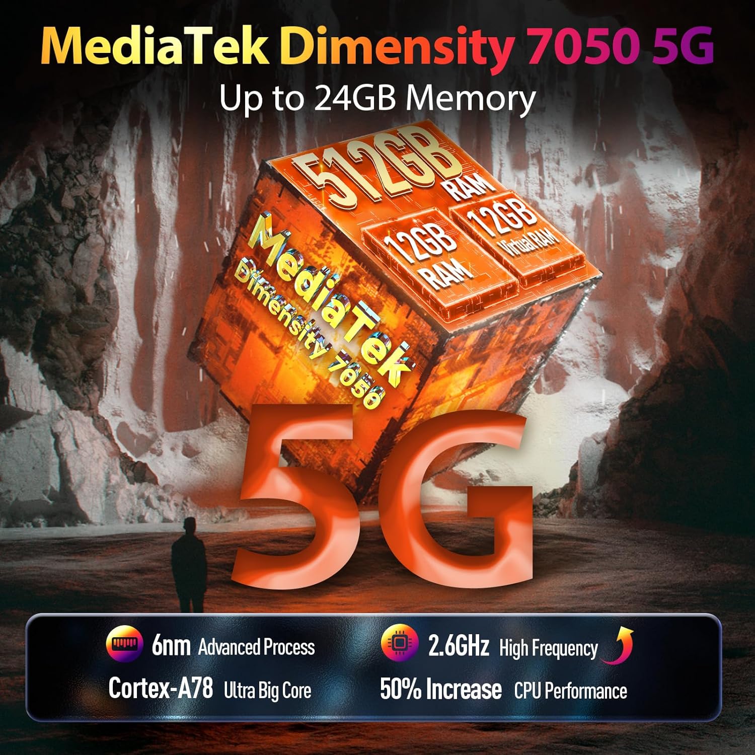- 【MediaTek Dimensity 7050 5G & 24GB + 512GB】2.6GHz high-frequency Arm Cortex-A78 CPU comes with powerful Arm Mali-G68 MC4 GPU with a leading 6nm process. 12GB RAM (up to 12GB of virtual RAM) allows multiple memory-hungry apps to run snappily at the same time. 512GB of internal storage as well as TF card expansion supported 2TB.
